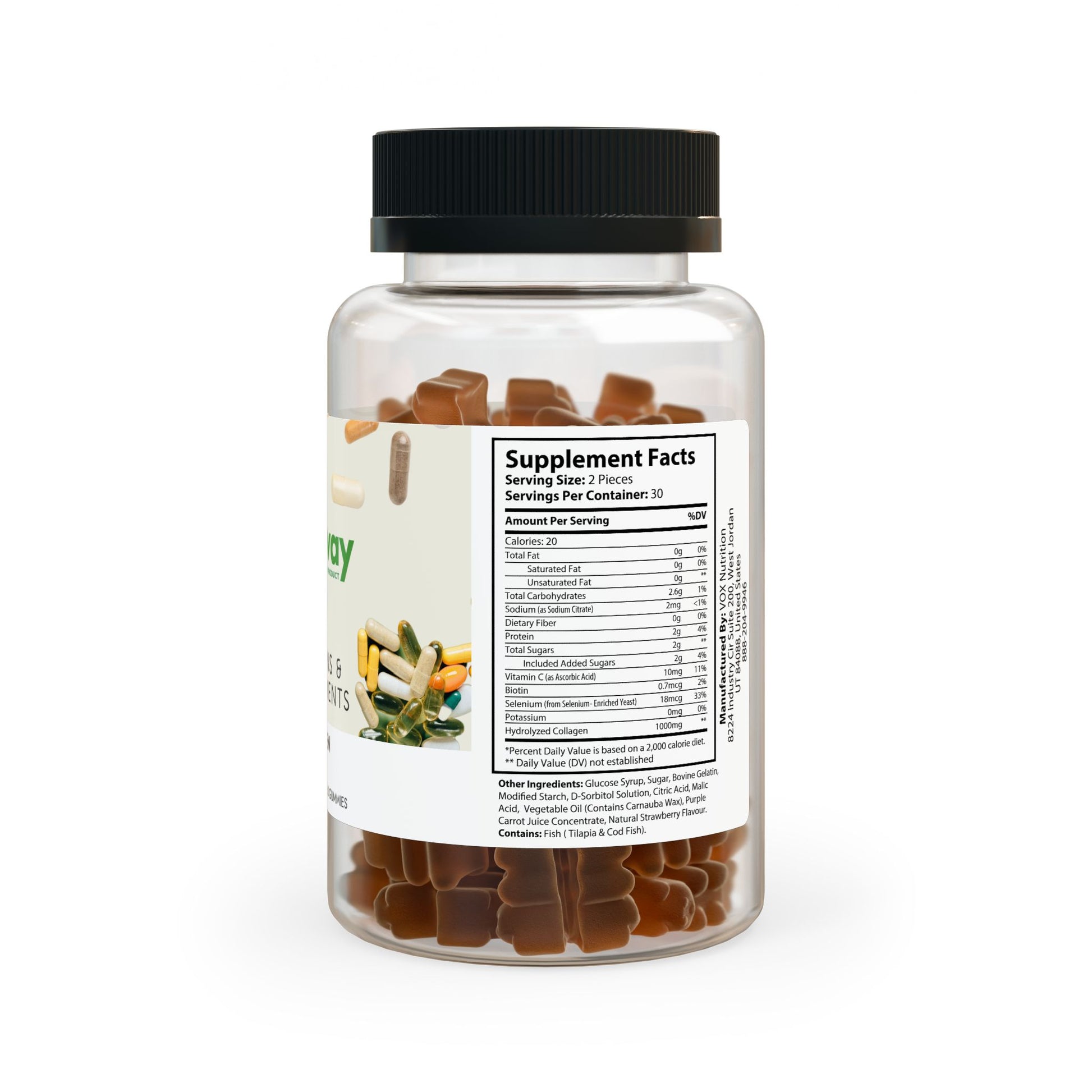 Ingredients: Sodium (as Sodium Citrate), Dietary Fiber, Protein, Included Added Sugars, Vitamin C (as Ascorbic Acid), Biotin, Selenium (from Selenium- Enriched Yeast), Potassium, Hydrolyzed Collagen. Other Ingredients: Glucose Syrup, Sugar, Bovine Gelatin, Modied Starch, D-Sorbitol Solution, Citric Acid, Malic Acid, Vegetable Oil (Contains Carnauba Wax), Purple Carrot Juice Concentrate, Natural Strawberry Flavour. Contains: Fish ( Tilapia & Cod Fish)
